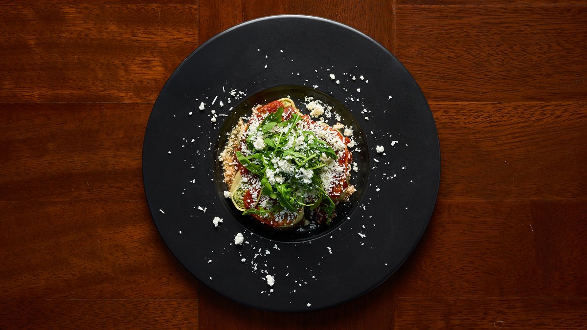 Baked pasta roll with mushroom, ricotta and hazelnut, served with beshamel sauce