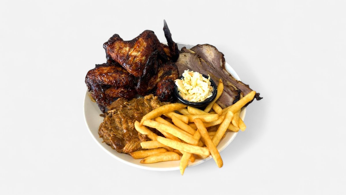 Beef patty, pulled beef, fried onions, smoked cheese, lettuce, tomato, BBQ sauce. Served with fries.