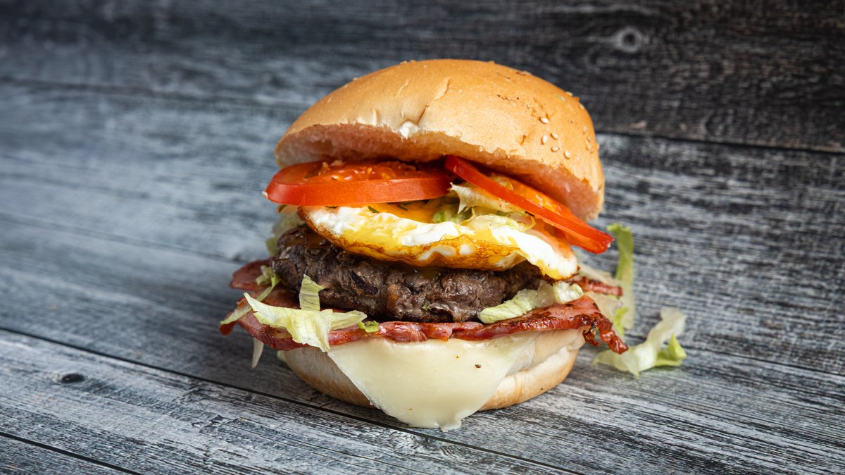 Homemade blend of high quality cuts of beef blended in a patty , lettuce,tomato,ketchup,egg,bacon & cheese