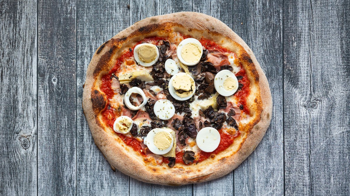 San morzano tomato sauce,mozzarella,ham,eggs,artichokes,olives,mushrooms