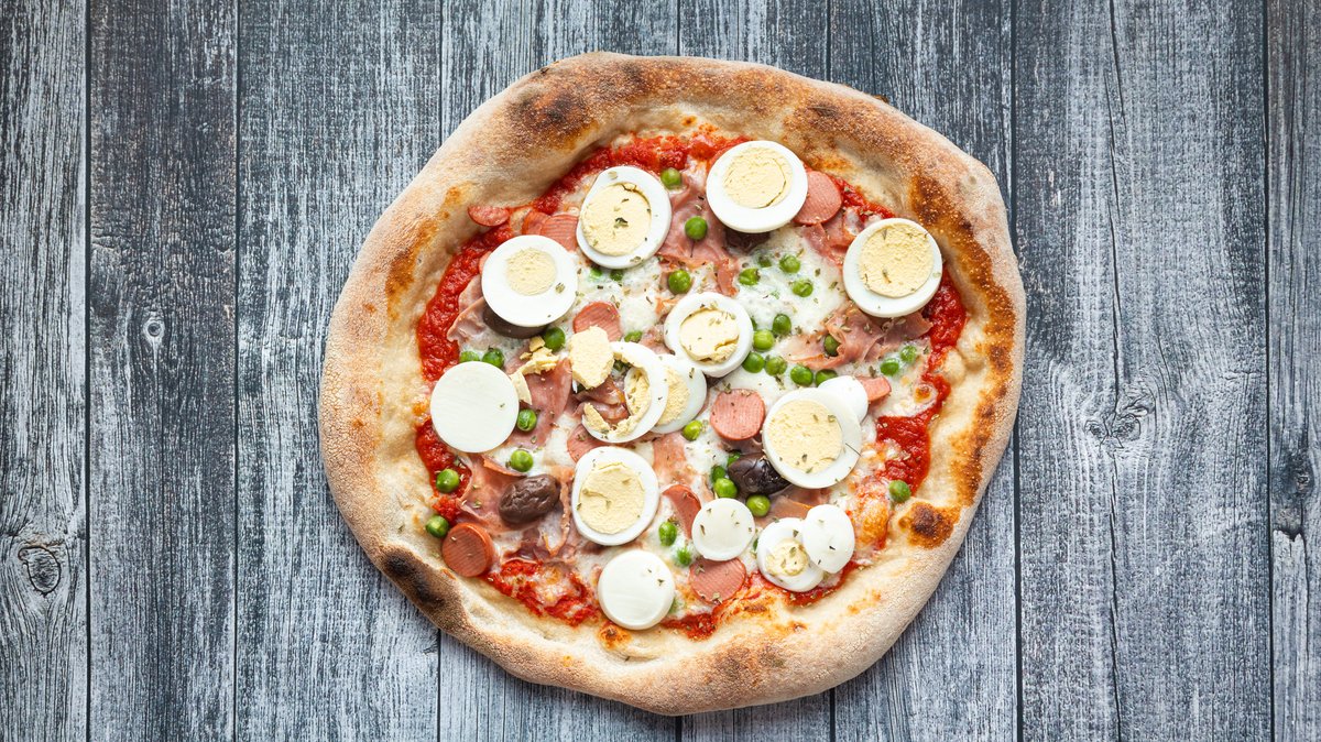 San morzano tomato sauce,mozzarella,mushrooms salami,eggs,olives