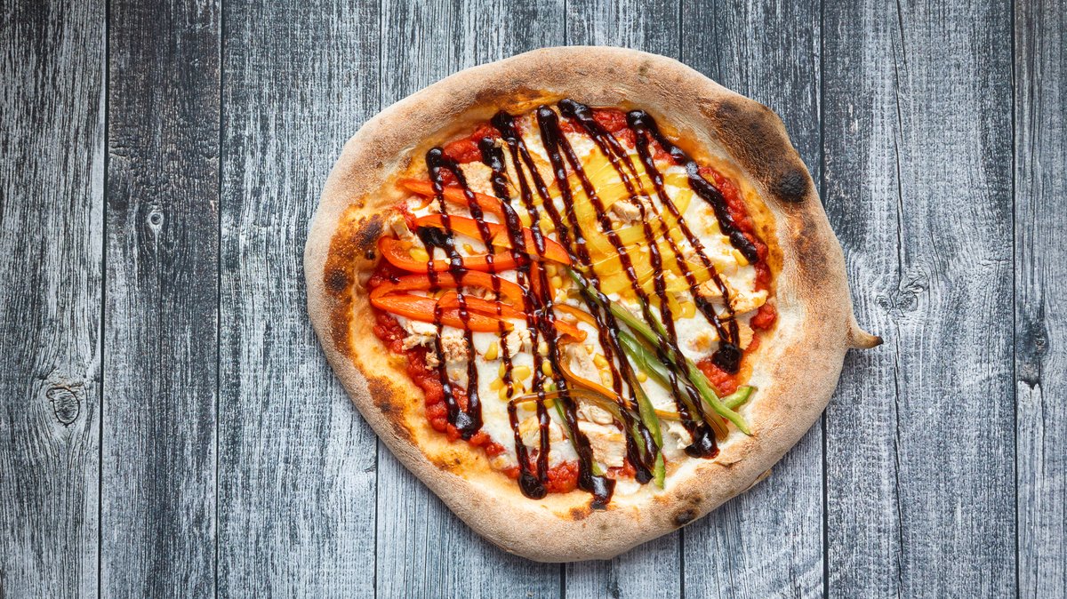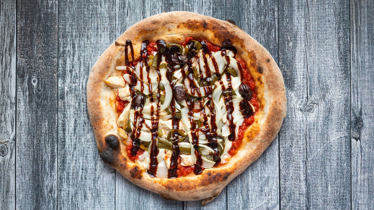 San marzano tomato sauce,chicken,bbq sauce,bell peppers,red onions,olives
