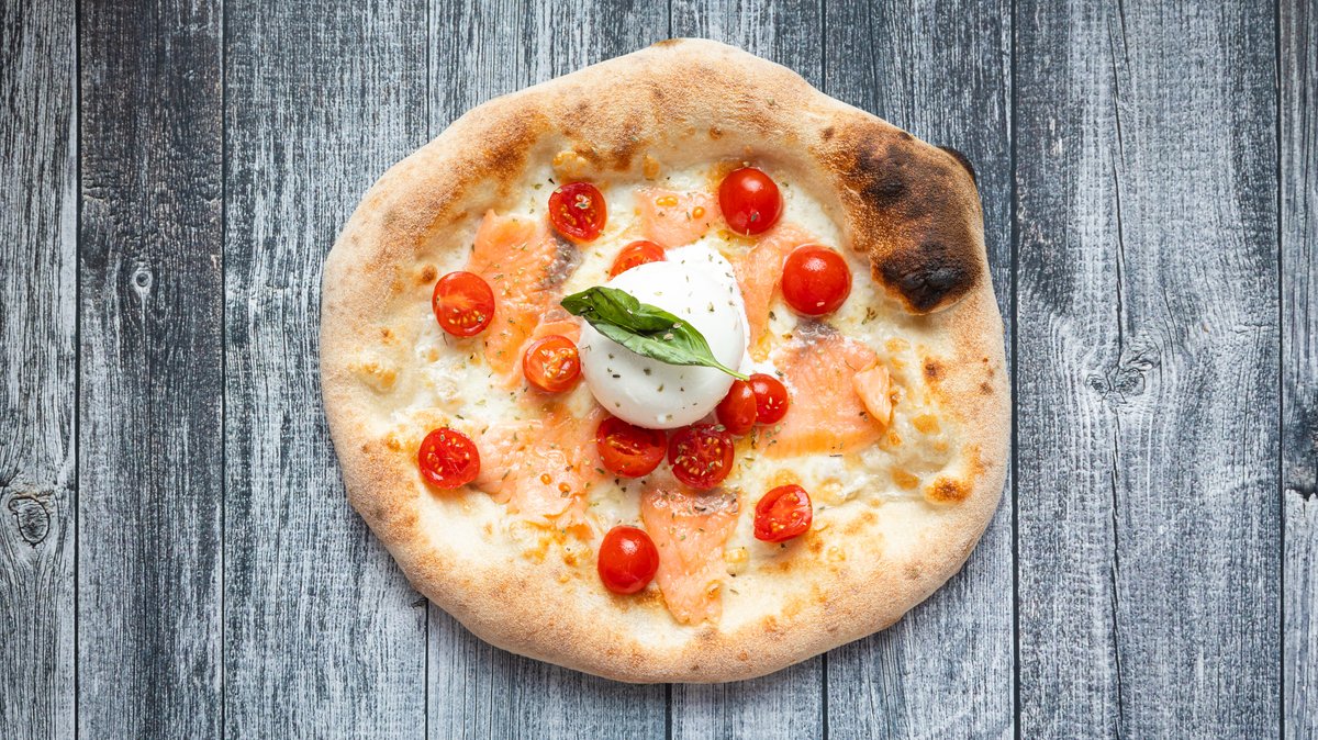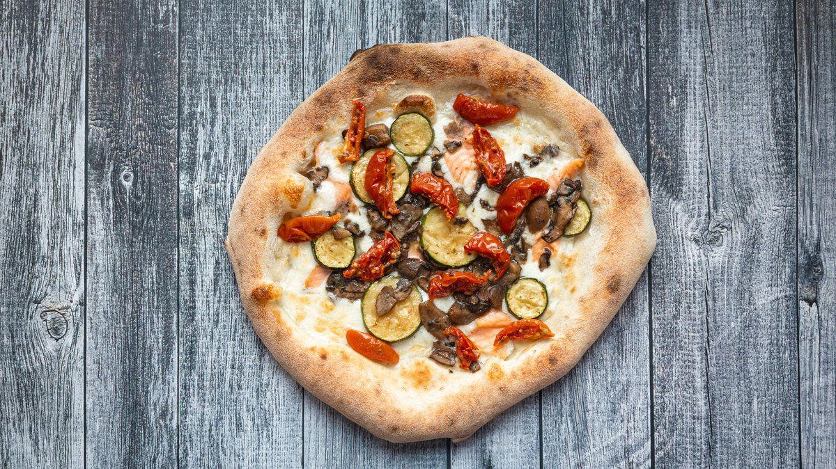 Mozzarella fior di latte,salmon,shrimps,zucchine,porcini mushrooms,pomodorini confit