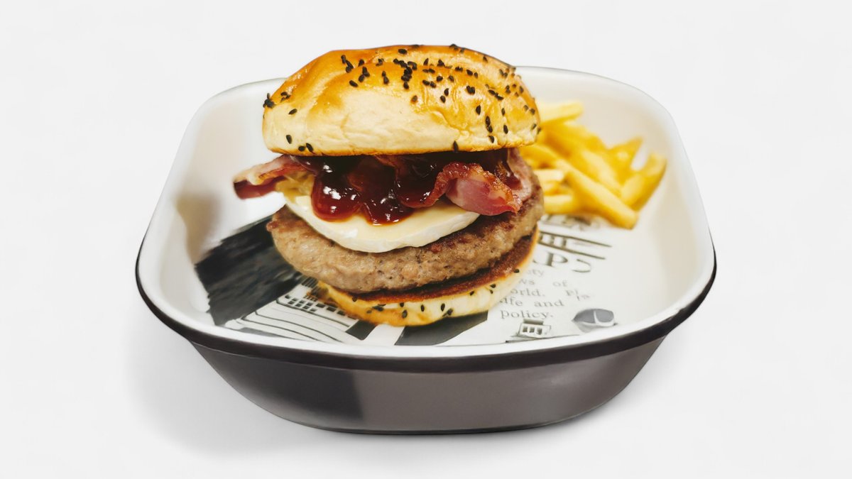 Brioche bun filled with bacon, Cumberland sausages, smoked cheese, fried eggs, Served with hash browns and baked beans
