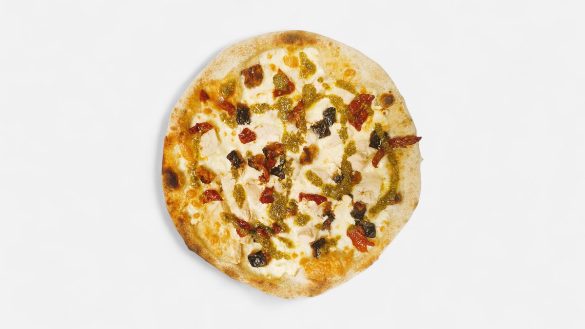 Fior di latte mozzarella, chicken, aubergines, sundried tomatoes, feta cheese, broccoli rabe pesto