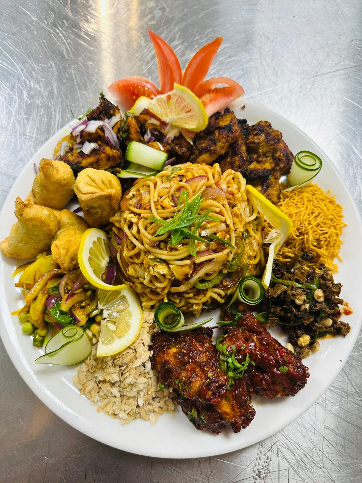 Choila chicken/pork/buffalo, momo of your choice (3pcs), aalu achar, vuteko chiura, sadheko bhatmas, gundruk sadheko, tama soup, green salad, lollipop, bhujiya.