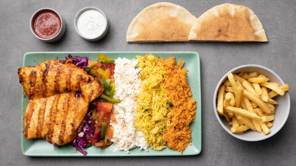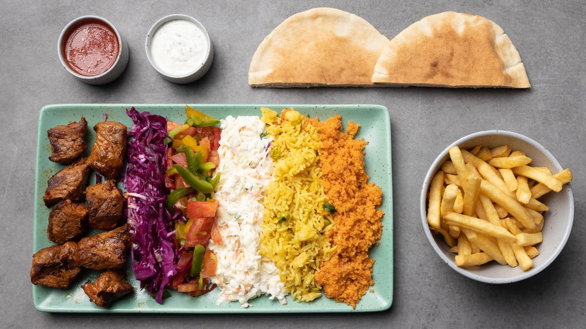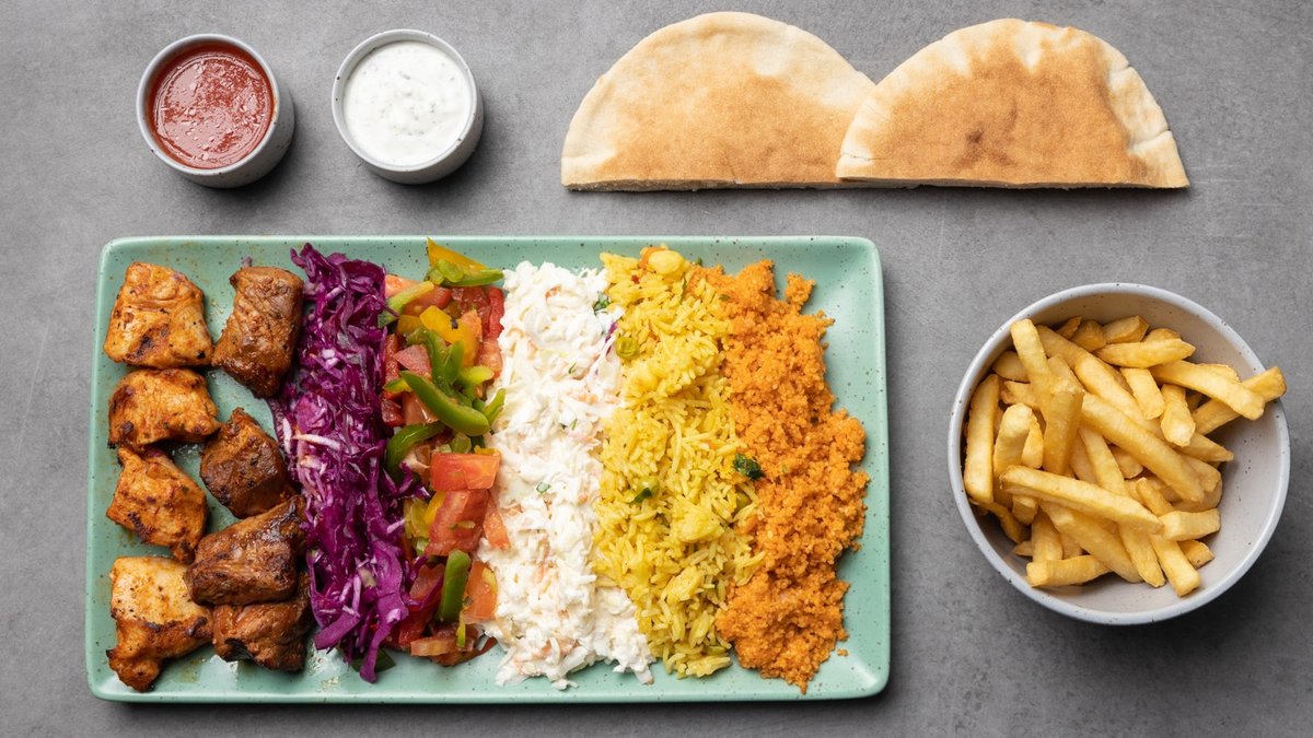 Lamb and chicken roasted meat, served in pita bread, wrap or on a plate