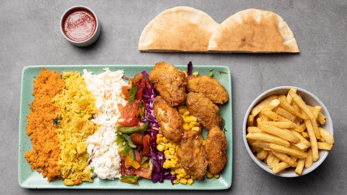 8 Onion rings, 4 spring rolls, 4 chicken tikka, 4 chicken wings, 4 mozzarella sticks and 4 nacho bites served with garlic sauce, sweet chilli sauce and bbq sauce