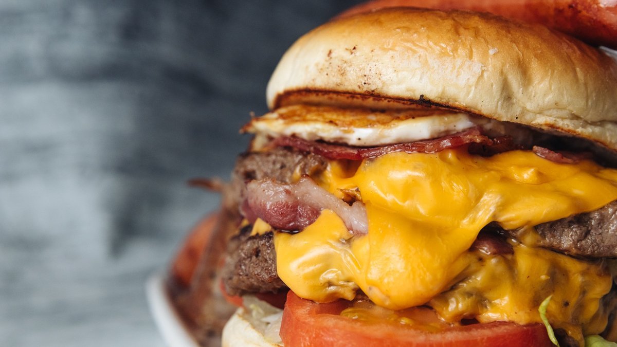 Triple burger, triple cheese , 2 pieces bacon and egg. Served with chips and salad