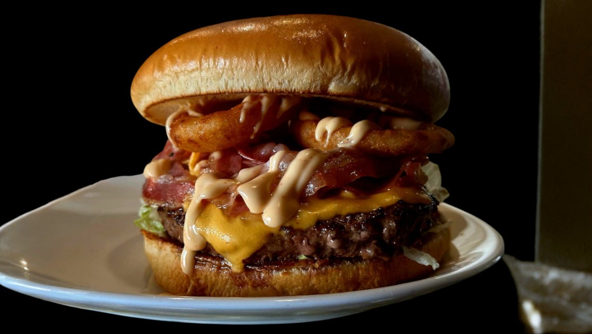 Brioche Bun, beef patty, double cheese, double bacon, 3 onion rings, and bbq sauce.
