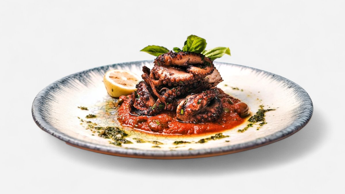 Crispy grilled octopus served with caper tomato sauce, Olives