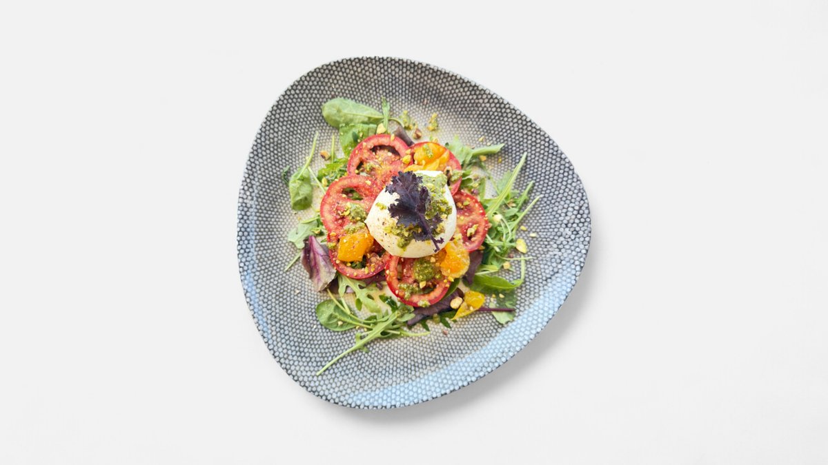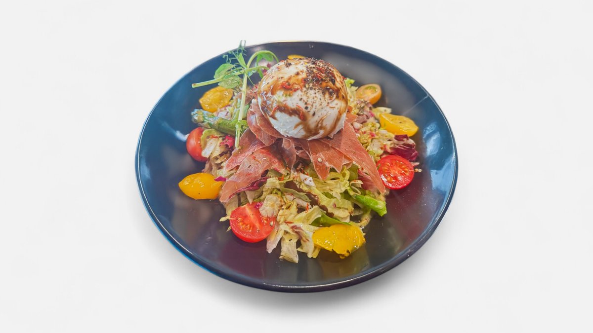 Garden leaves, cherry tomatoes, sun gold tomatoes, asparagus, mozzarella di bufala, Parma ham and crushed peppers. Drizzled with olive oil and balsamic reduction