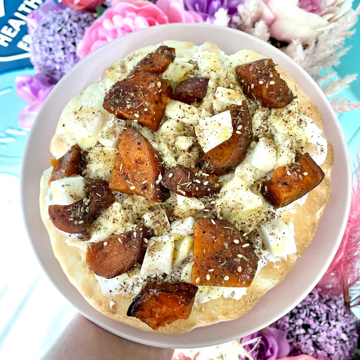 Homemade gluten free pizza base, cream cheese, mozzarella, chevre, potato, za’atar, and honey. Approx. macros per pizza: 798 C 34 F 84 C 35 P Size: 20cm