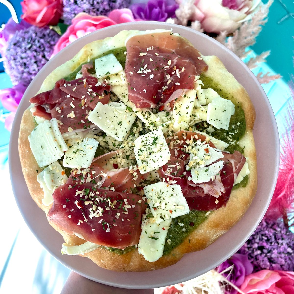 Homemade almond flour keto pizza base, basil pesto, feta cheese, mozzarella, pistachio and oregano. Approx. macros per pizza: 767 CAL 61 F 15 C 32 P Size 18cm