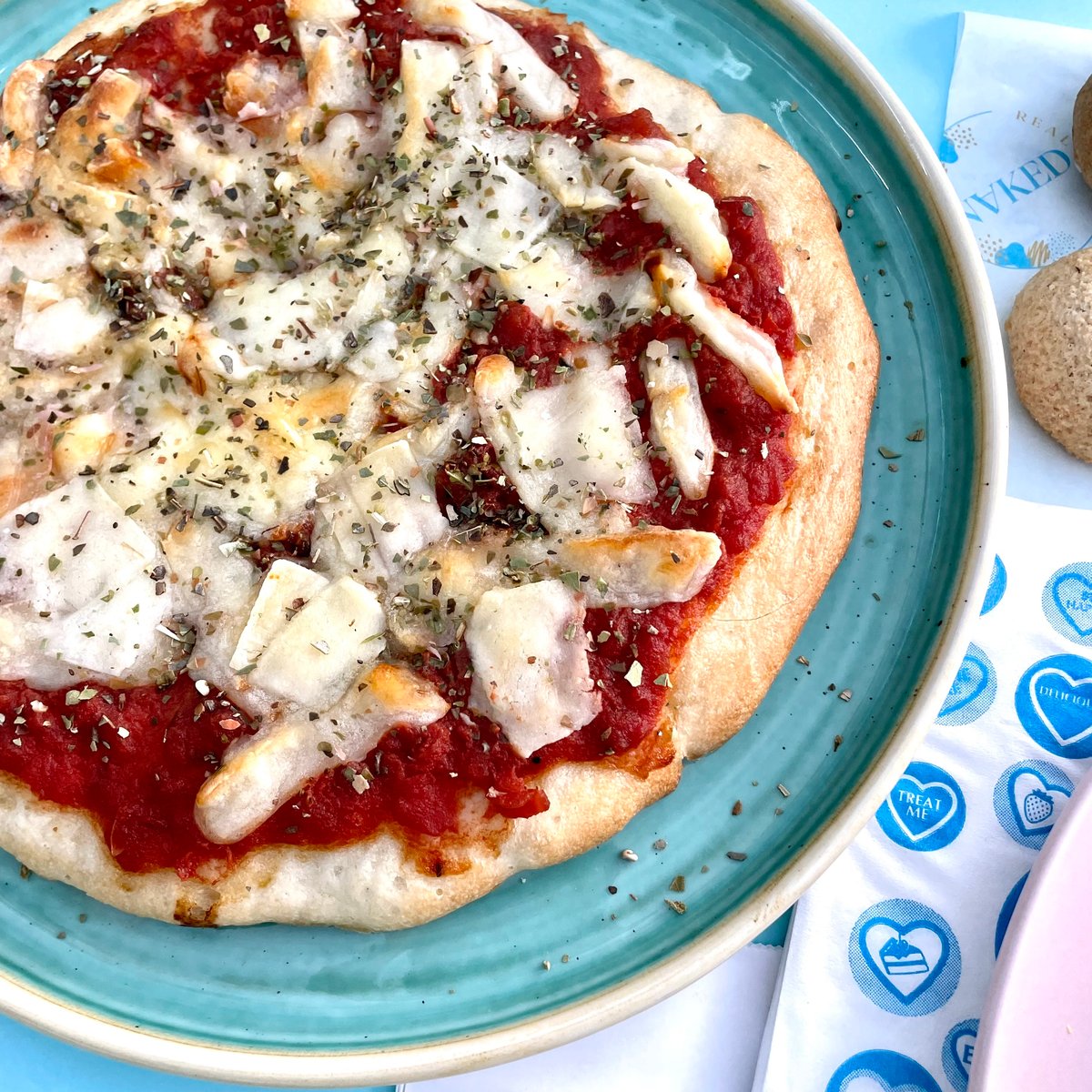 Homemade gluten free pizza base, marinara, vegan mozzarella, vegan cheddar, and oregano. Size: 20cm Approx. macros per pizza: 618 CAL 26 F 82 C 9 P