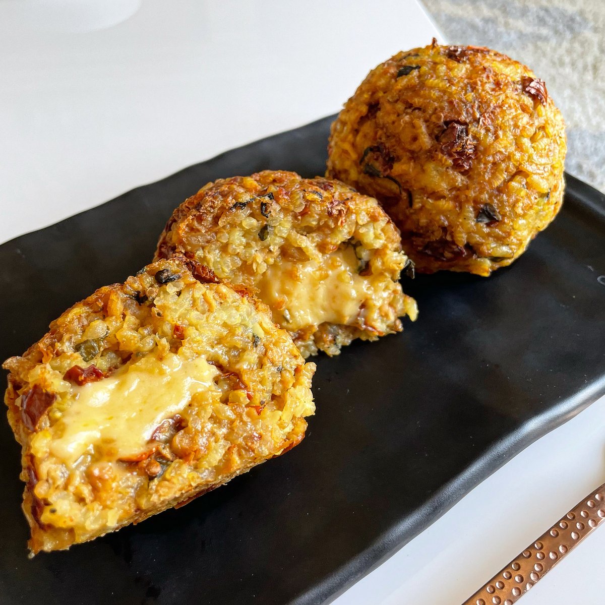 Homemade sicilian arancini with basil, sundried tomato, vegan cheese and soy protein. Approx. macros per serving: 1207 CAL 28 F 217 C 20 P