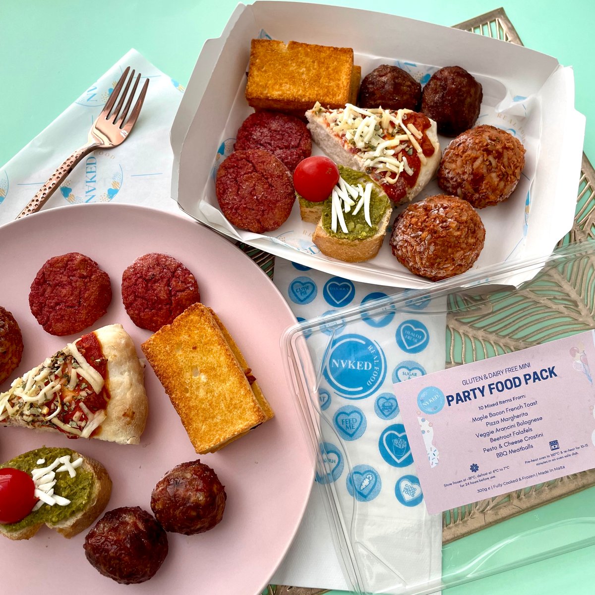 Party food pack for that 1 celiac or vegan person in the group! Pack contains 10 mixed items from: Avocado, Queso & Bean Quesadilla | Basil & Sundried Tomato Arancini | BBQ Pulled Jackfruit & Corn Focaccia |Teriyaki Tempeh Steaks | Caramelized Pear & Maple Cheese Crositini with Walnuts | Pesto Pistachio & Caramelized Apple Pizza | Onion Jam & Mozzarella Potato Skins | Beet & Za’atar Hummus Toastie with Zucchini Sold full cooked & frozen, simply thaw, re-heat & enjoy!