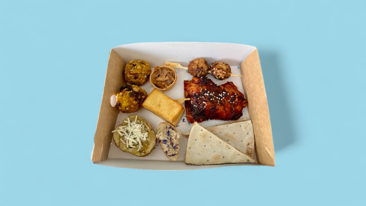 Pack contains 9 mixed items from: Maple bacon french toast, veggie arancini bolognese, pizza margherita, beetroot falafels, pesto and cheese crostini and barbecue meatballs. Sold full cooked and frozen, simply thaw, re-heat and enjoy!