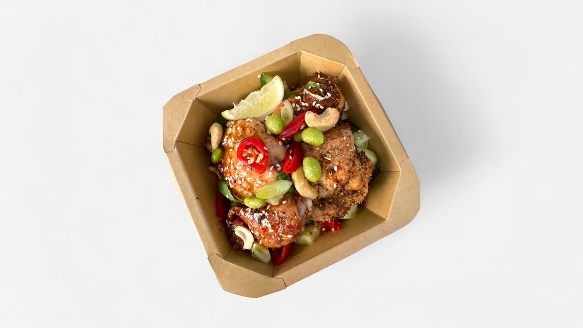 Chicken Thigh, Cauliflower, Cucumber, Edamame Beans, Cashew Nuts, Sweet Chilli Sauce, Chillies, Sesame Seeds, Onion, Lime. Served cold Approx. macros per bowl: 558 CAL 38 F 8 C 46 P