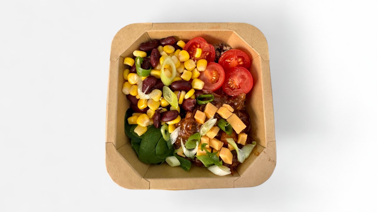 Quinoa, Pulled Pork, Red Kidney Beans, Sweet Corn, Spinach, Cherry Tomato, Vegan Cheese, BBQ Sauce, Onion. Served Cold Approx. macros per bowl: 630 CAL 22 F 72 C 36 P