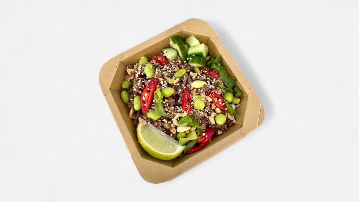 Rice, Beef, Cucumber, Edamame Beans, Peanuts, Sweet Chilli Sauce, Chillies, Sesame Seeds, Onion, Lime. Served cold Approx. macros per bowl: 684 CAL 24 F 79 C 38 P