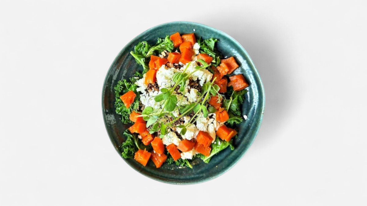 Oven roast pumpkin, rainbow quinoa, rucola, kale, crushed almonds with a maple and citrus dressing ( picture with added feta)