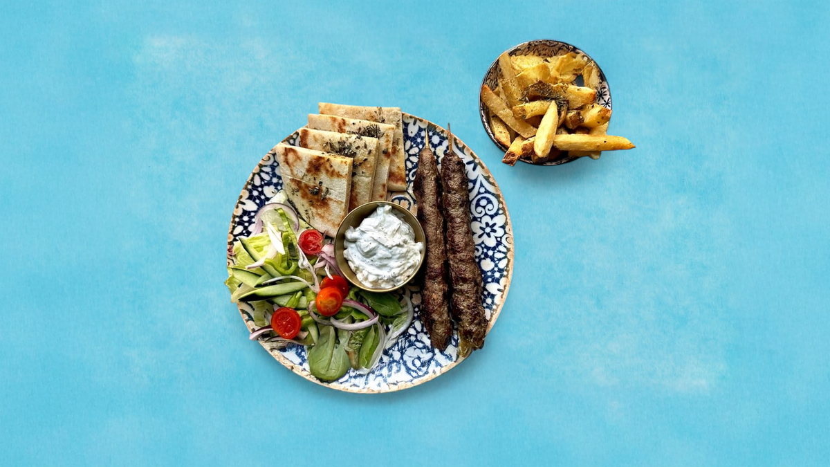 Lamb souvlaki with Tomatoes, Onions & Hand Cut Fries. Served with a Tzatziki Sauce