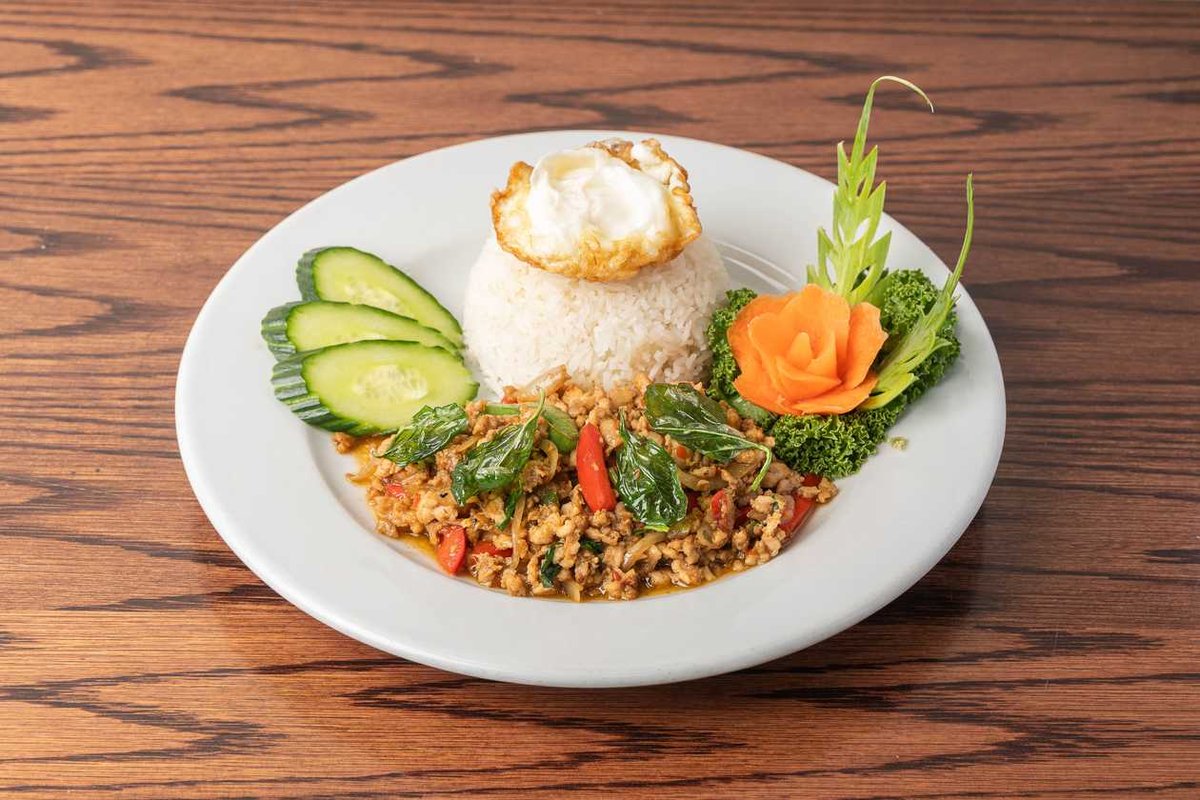 This staple dish in Thailand is a stir-fried of fresh holly basil, garlic, sweet pepper in a flavorful sauce, a portion of rice