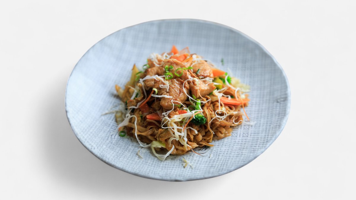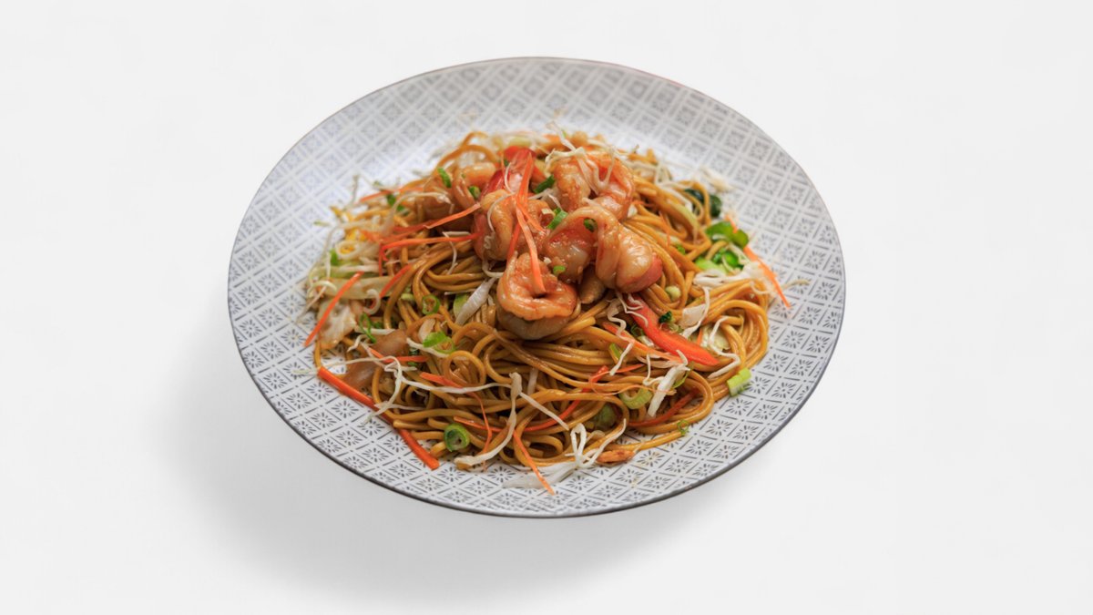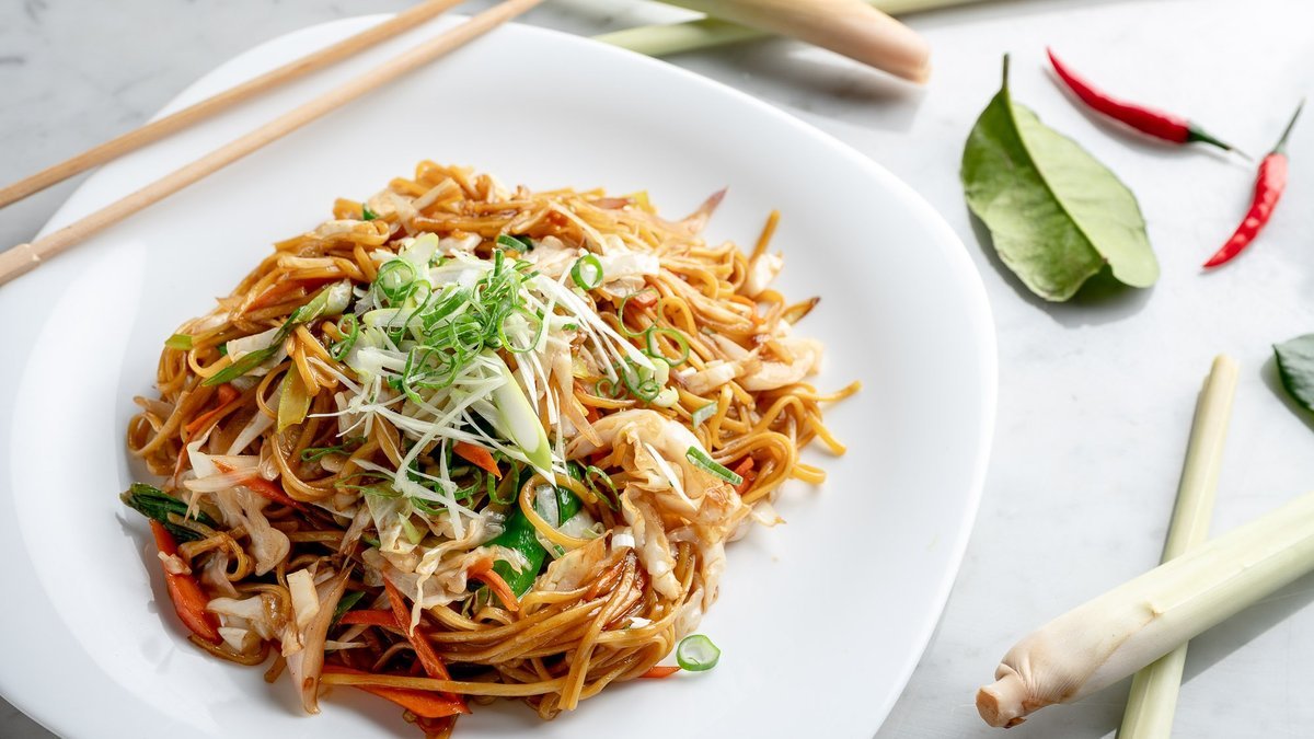 Stir-fried egg noodles with, cabbage, carrot and spring onion