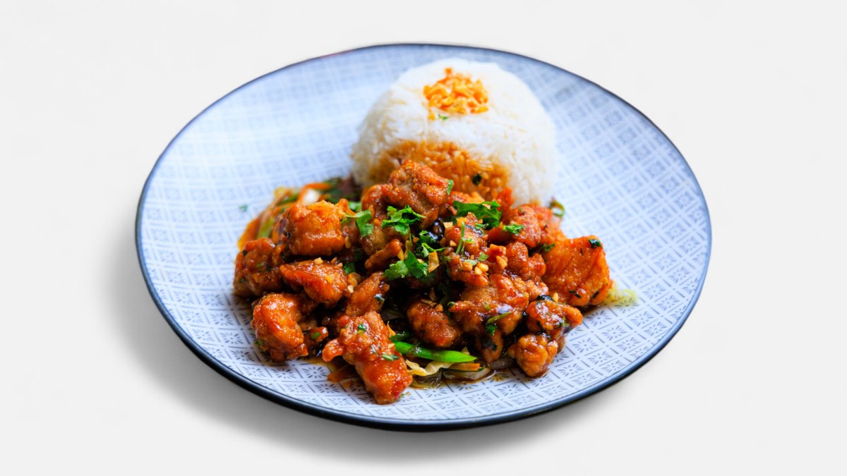 Deep fried Chicken mixed with savory sauce, a portion of rice