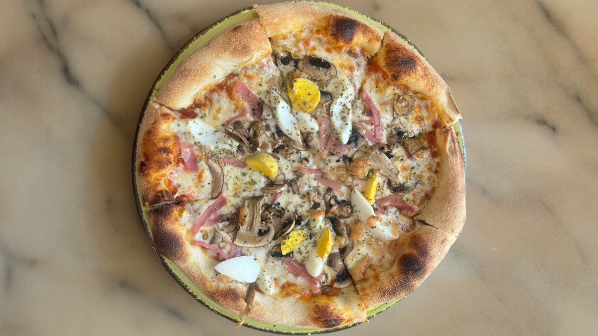 Pizza base topped with rich tomato sauce, shredded mozzarella, sliced ham, mushroom, eggs, garlic and oregano