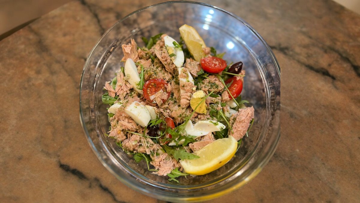 Tuna chunks, lettuce, cherry tomatos, black olives, onions, rucola, boiled egg