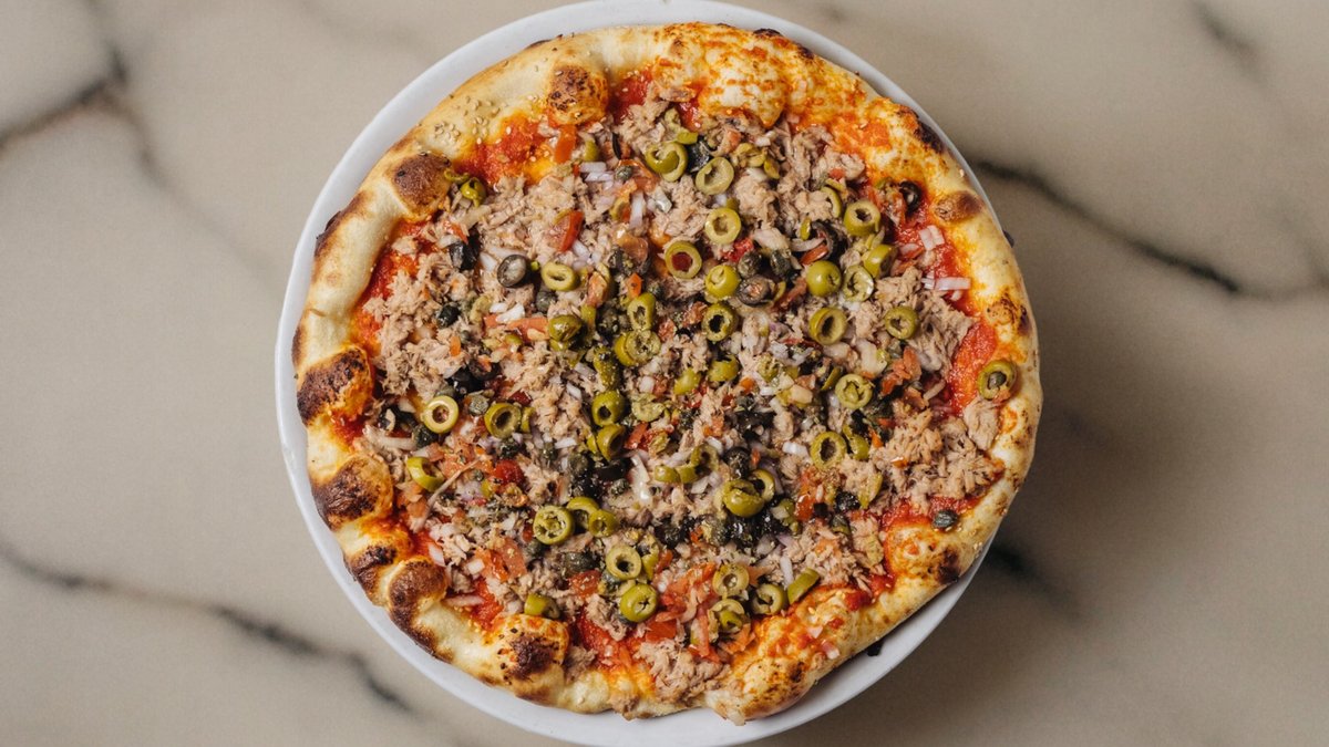 Tomato sauce, tuna, onions, olive and diced tomatos