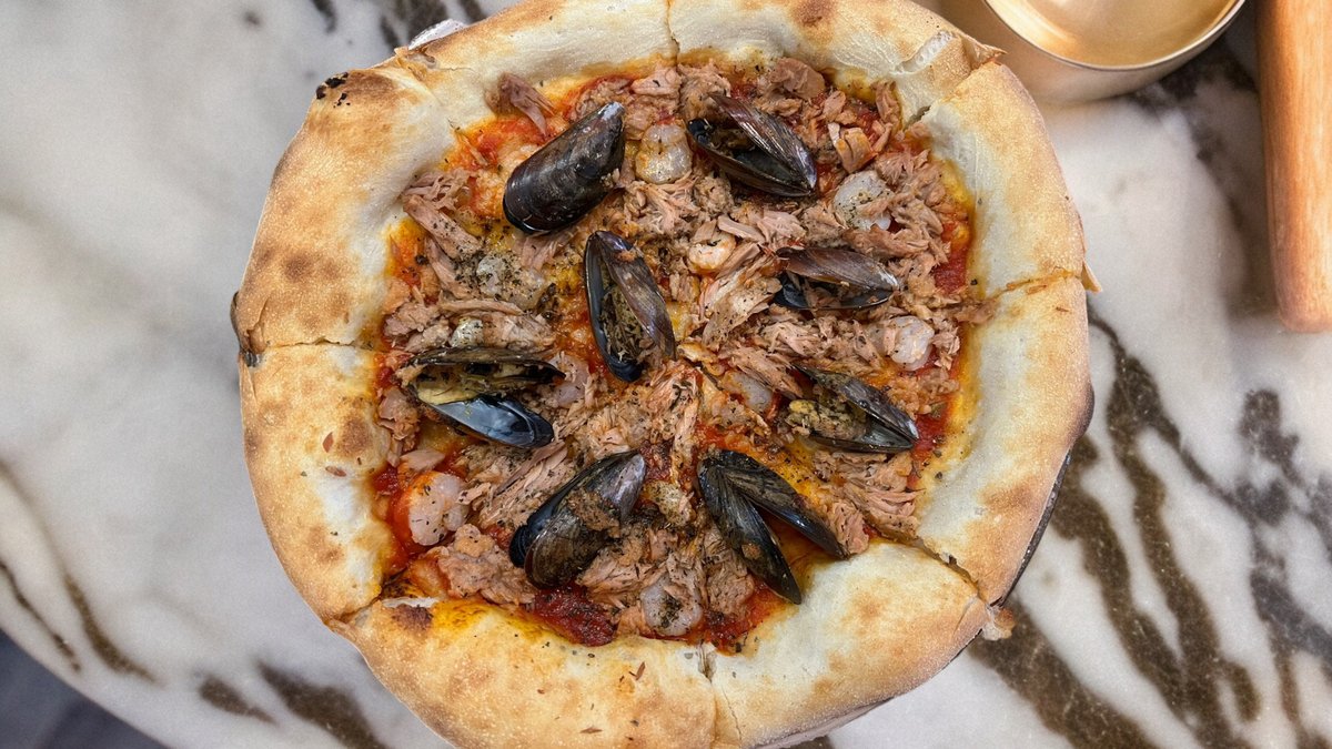 Pizza base topped with rich tomato sauce, tuna, black shell muscles,shrimp, herbs and garlic
