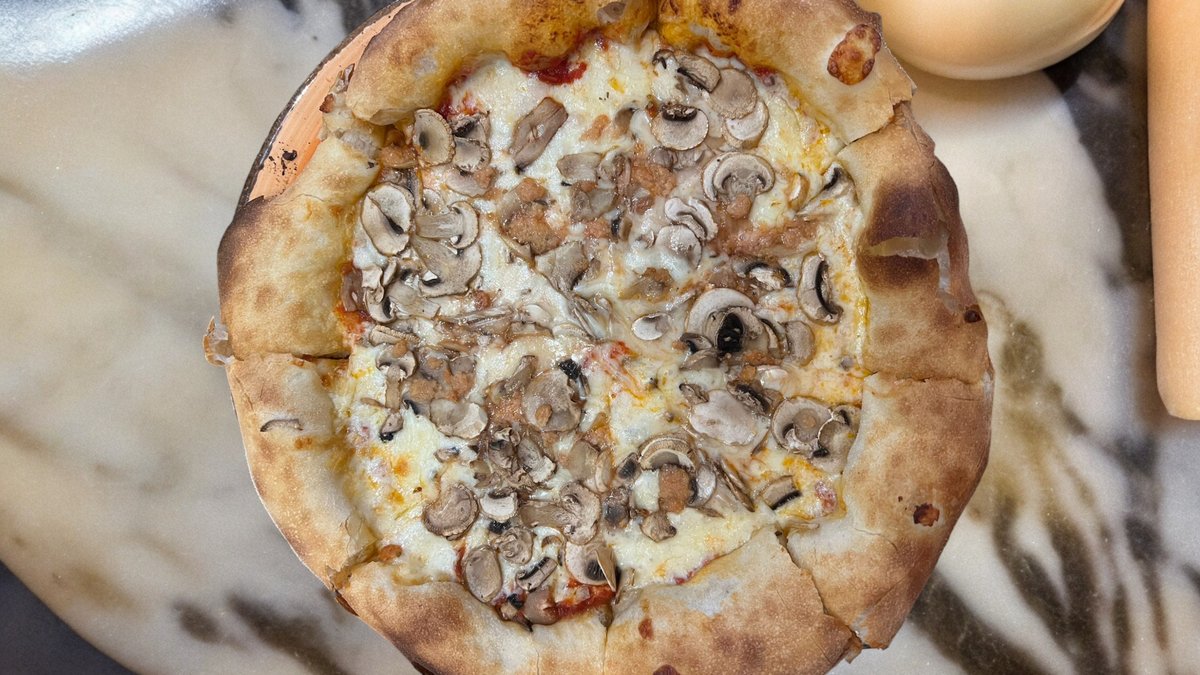 Pizza base topped with rich tomato sauce, shredded mozzarella, sliced mushroom, garlic