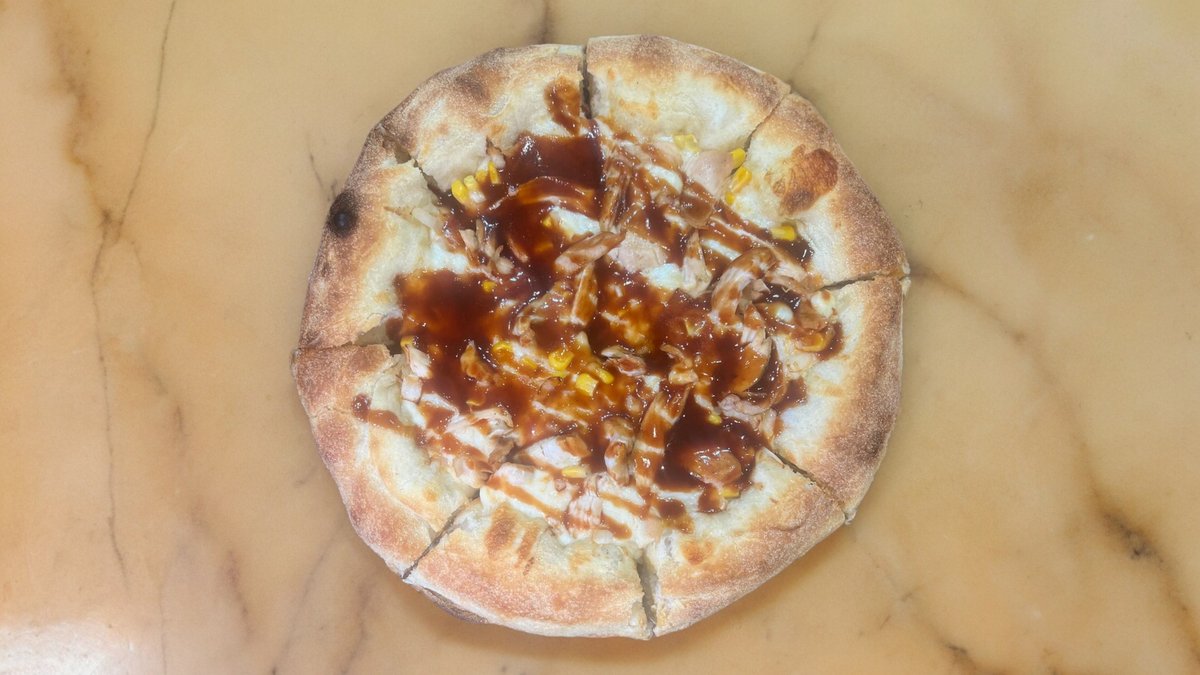 Pizza base topped with rich tomato sauce, shredded mozzarella, barbeque sauce, fresh chicken breast, sweet corn, sliced onions and oregano
