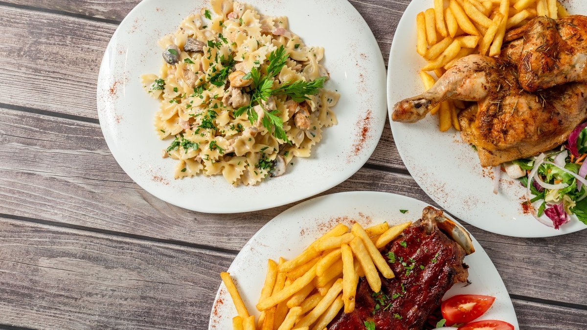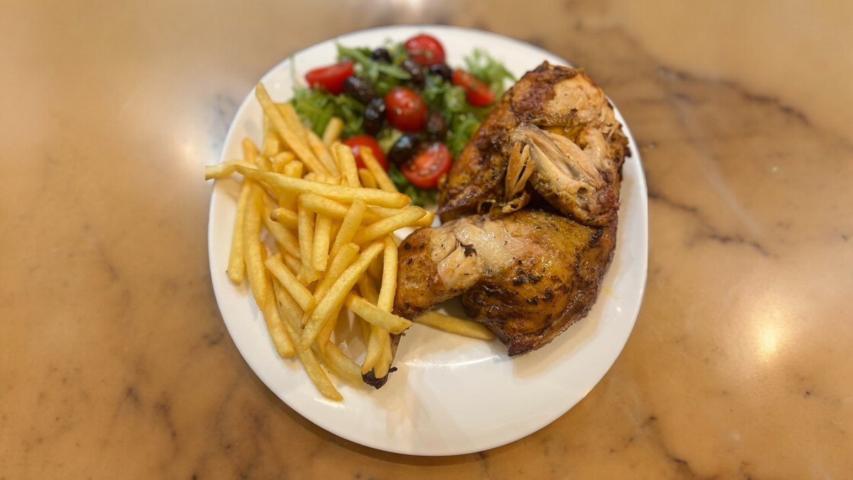 Baked half chicken, fries and salad