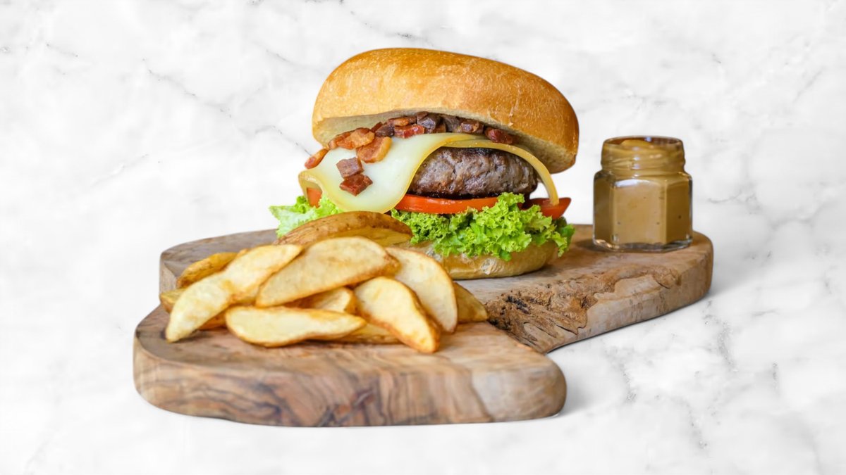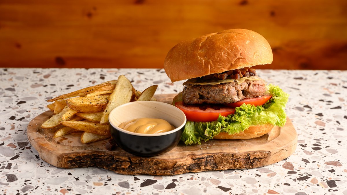 Homemade Angus beef burger, lettuce, sliced tomato, scamorza cheese, crispy pancetta and bbq sauce, served with homemade fries