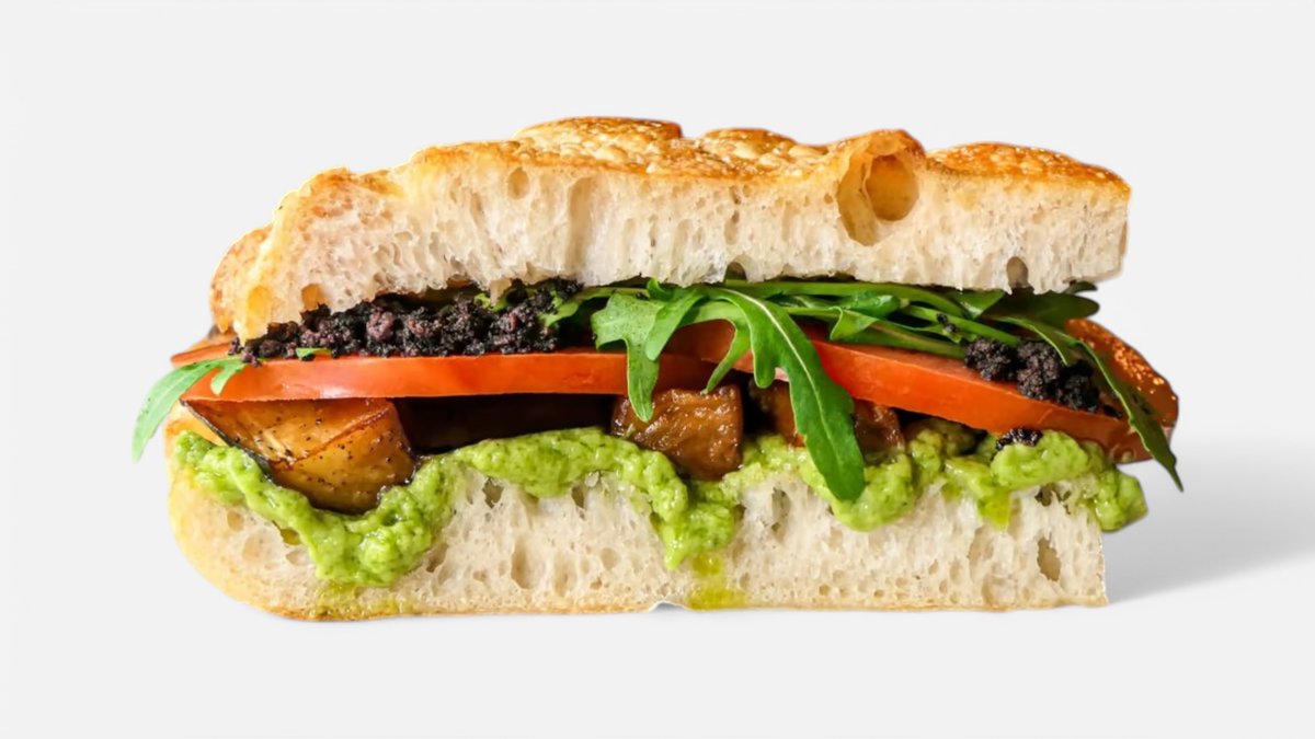 Homemade avocado cream, fried aubergine, sliced tomato, rucola, dehydrated kalamata olives and EV olive oil