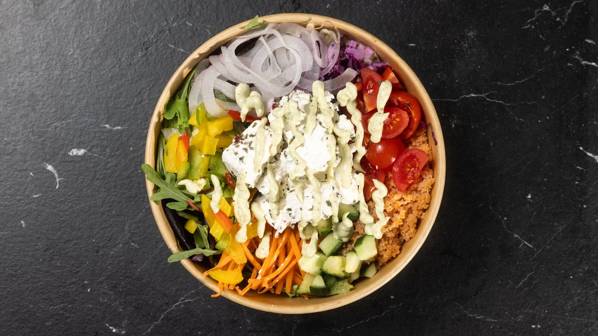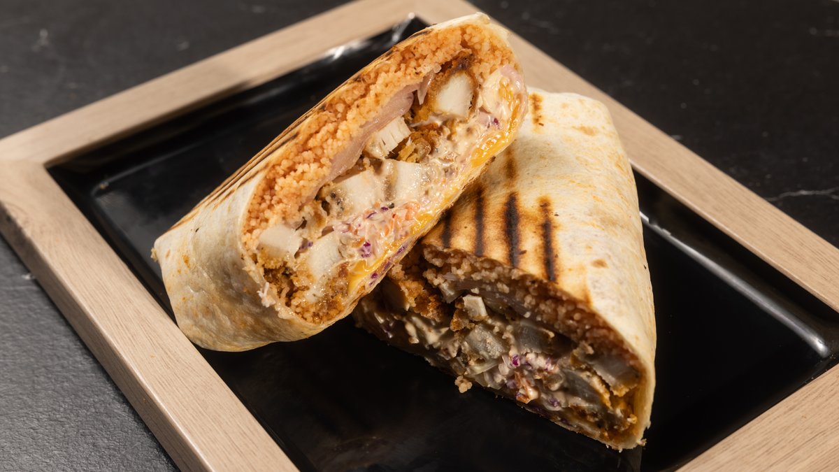 Couscous, red onions, southern fried crispy chicken, Mexican cheese, house slaw and sriracha mayonnaise