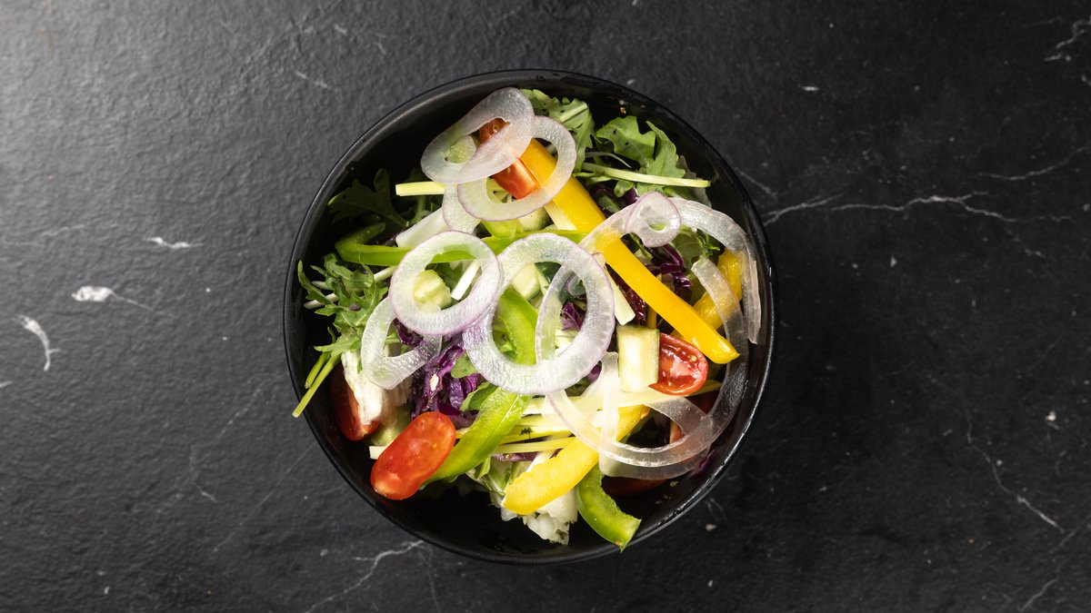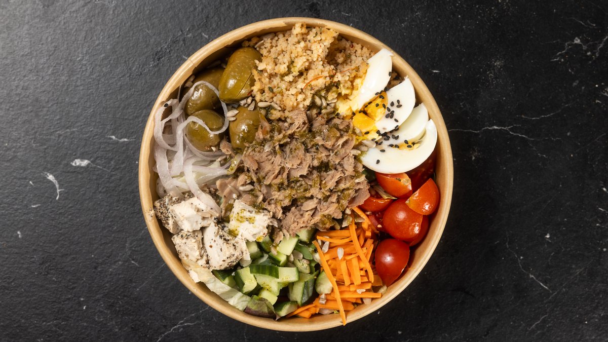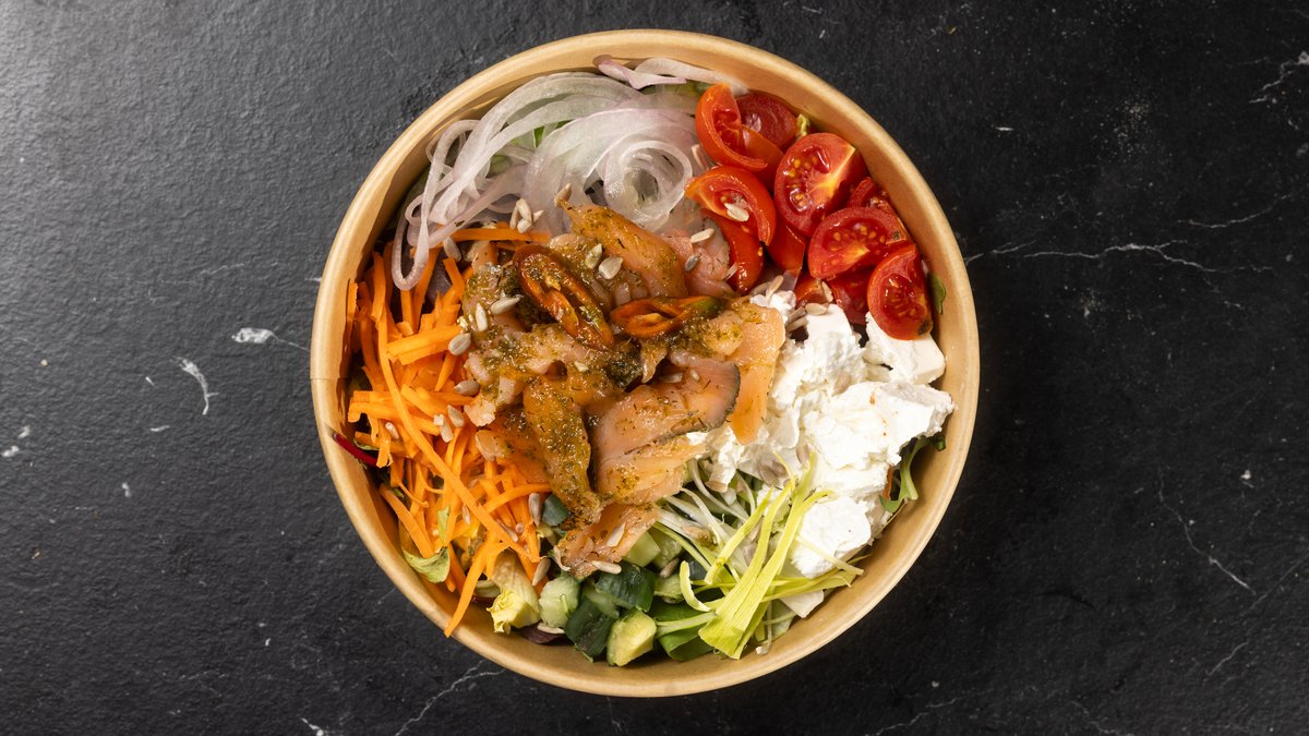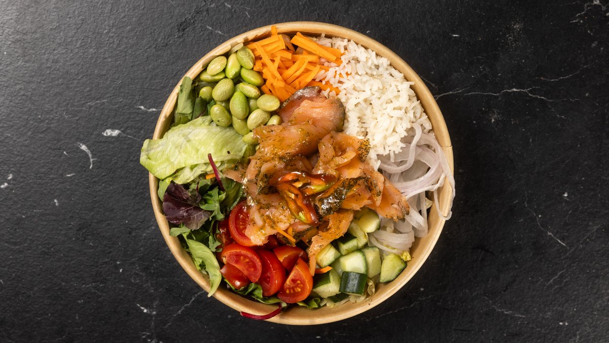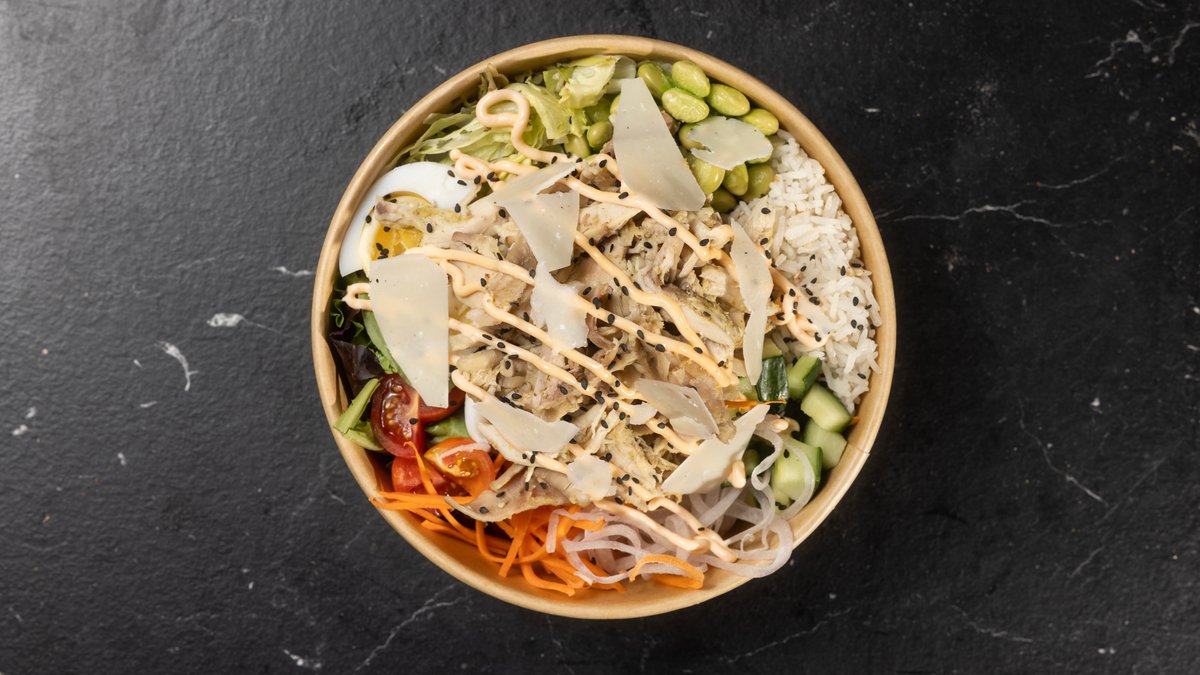 Steamed rice, mixed leave salad, cherry tomatoes, edamame beans, cucumber, red onion, carrots, boiled egg, roasted chicken, siracha mayo, diced mango, seeds and grana shavings