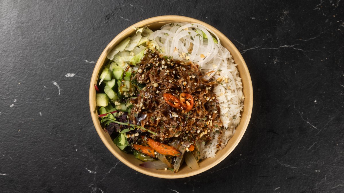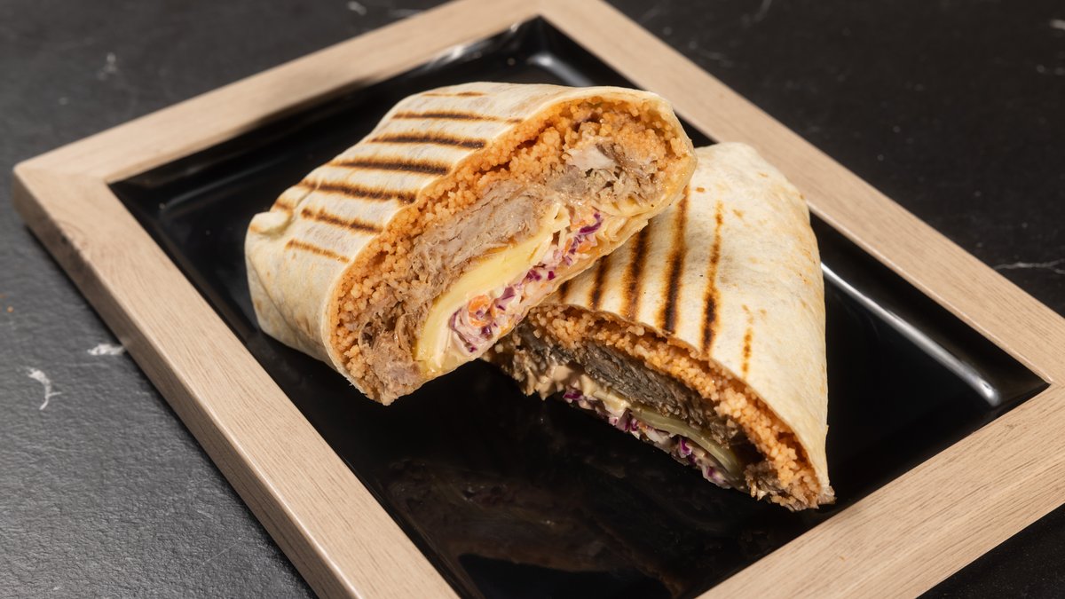 Couscous, pulled pork, homemade bbq sauce, mature cheddar and house slaw