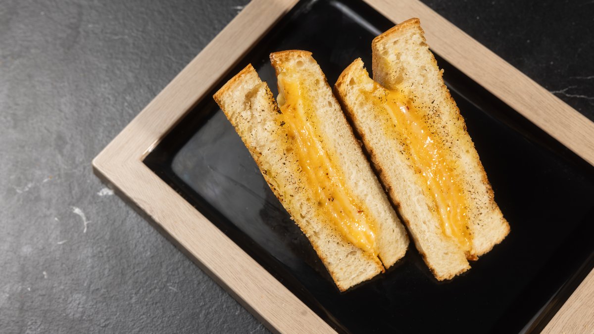 Garlic & herb butter, gouda cheese, red leicester cheese, and provolone cheese.