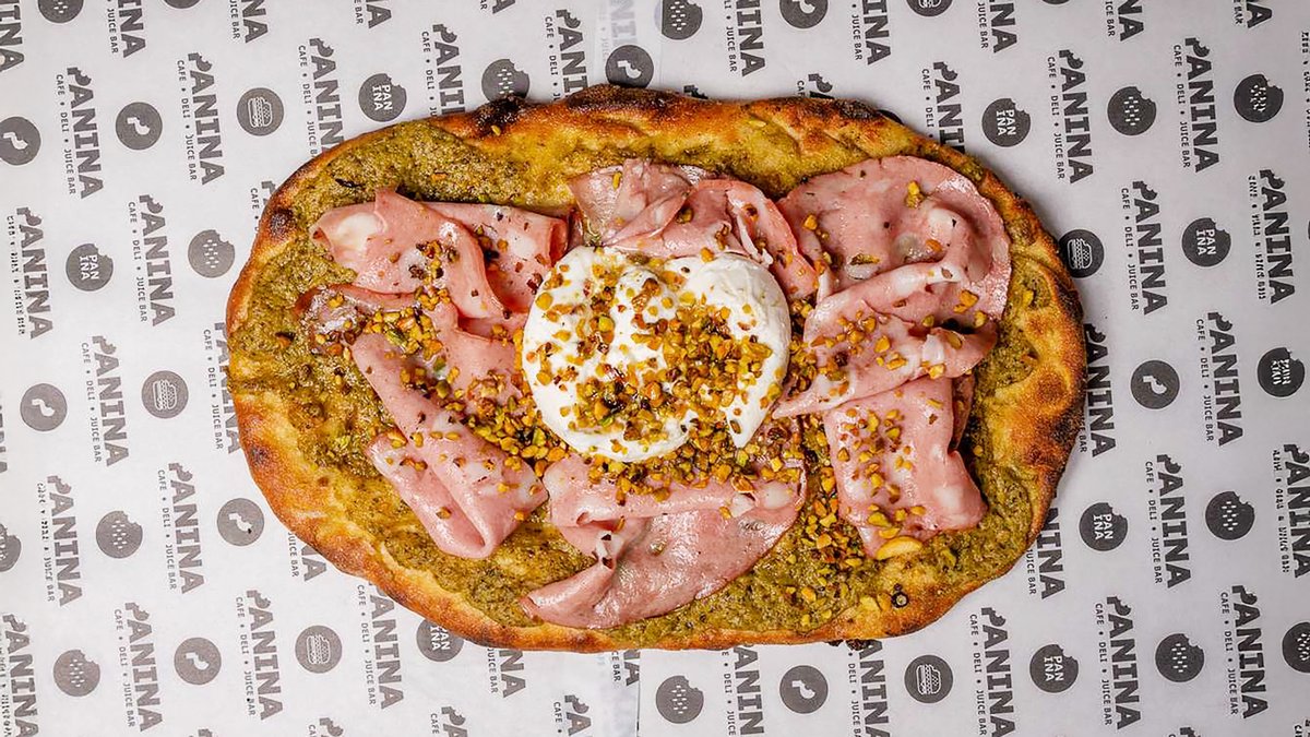 Mortadella di Pistachio, Burrata, Pistachio Bits, Crispy Onions, In-house Pesto Genovese + EVO Oil If you would like to switch the In-house Pesto from Genovese to Pistachio or vice versa, please select the option in the 'Add-Ons' section below. Requests made in the comments section will not be processed. Cross-contamination may occur. Not suitable for coeliac or severe gluten intolerance. Please contact the outlet if you have serious allergies. If you would like this item to be toasted, please mention it in the comments section. Please note that our Ftira and Ciabatta are made from the same ingredients and are of the same size. As all our bread is freshly made, availability may vary.