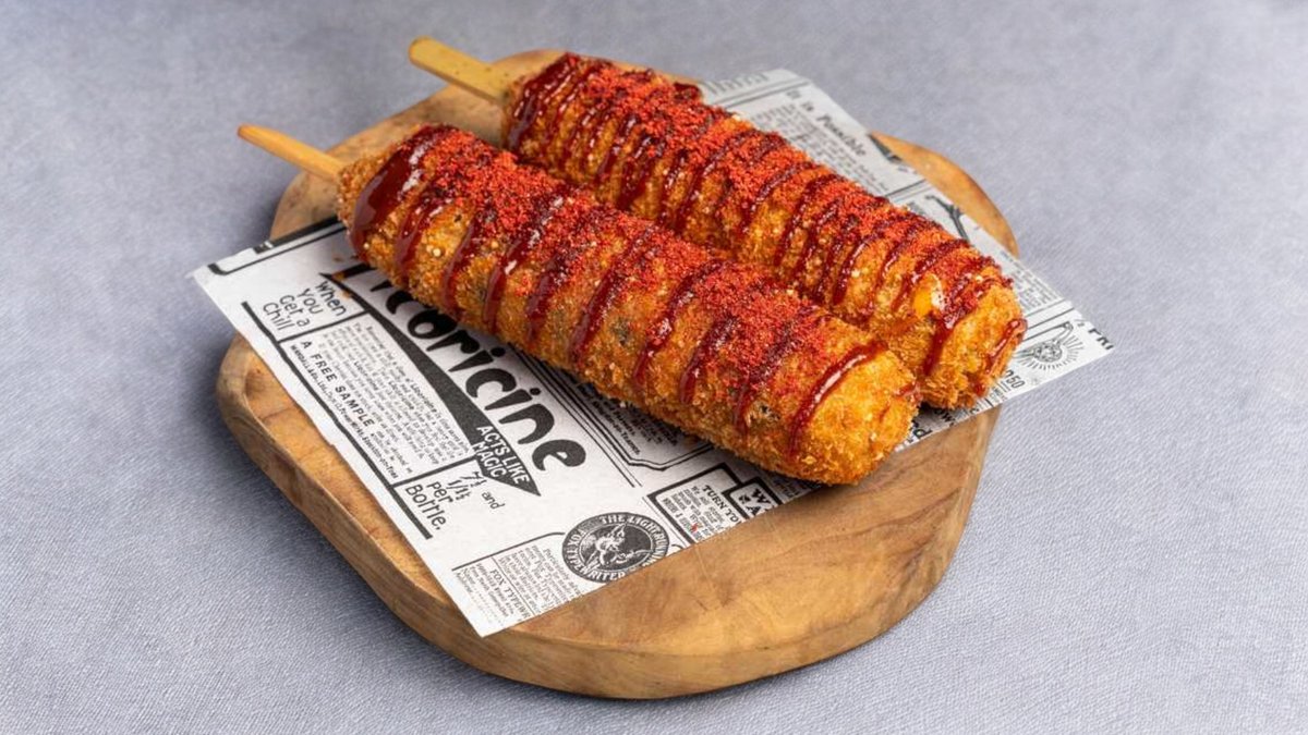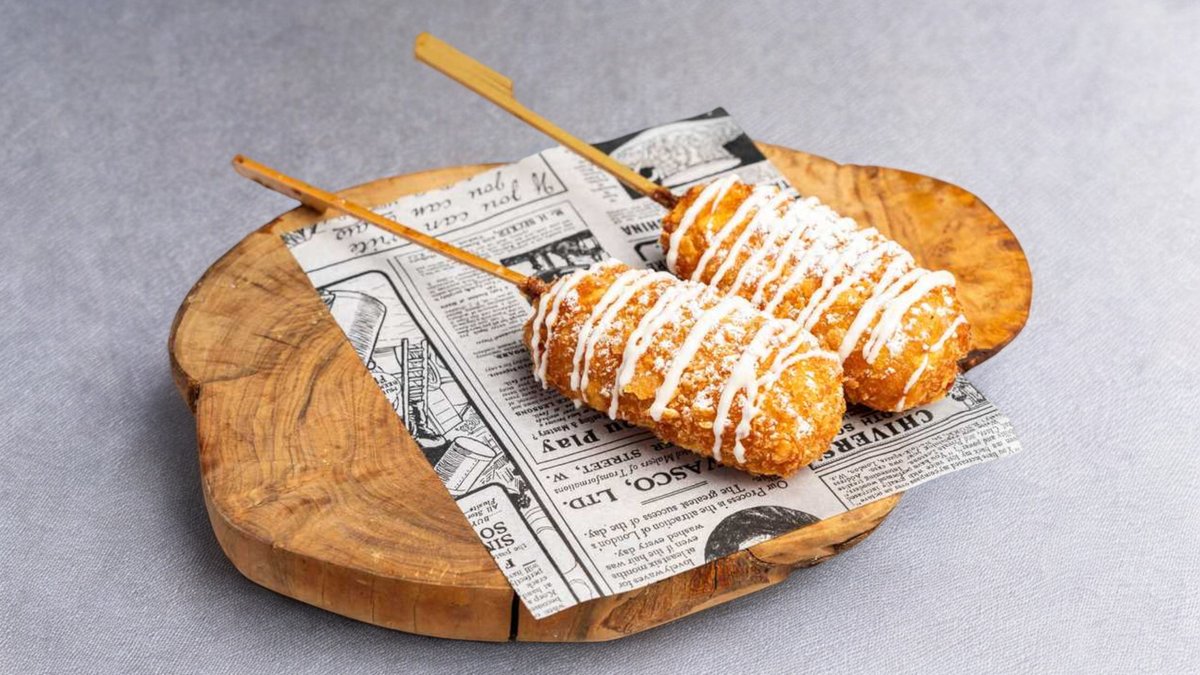 Corn battered sausages wrapped in cheese, fried until crispy. Served with a ketchup and mayonnaise drizzle