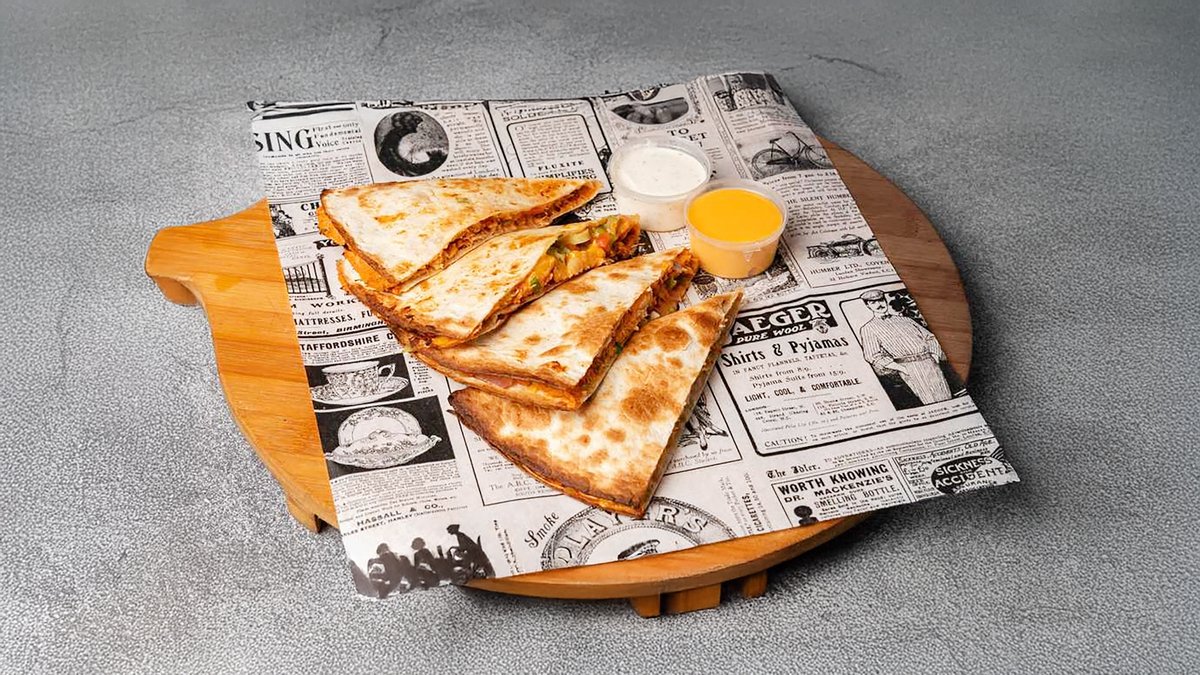 Wheat tortilla filled with your choice of pulled pork or pulled chicken. Stuffed with pico de gallo, red leichester, mozzarella, spring onions, and served with sour cream.