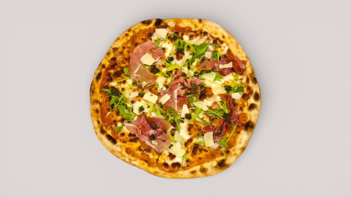 Tomato sauce, mozzarella, rucola, parma ham, parmesan, and basil oil