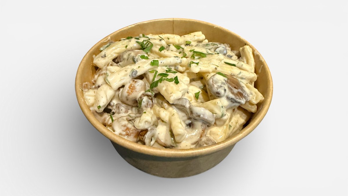 Casarecce pasta coated in a rich truffle cream sauce with sauteed garlic mushroom.