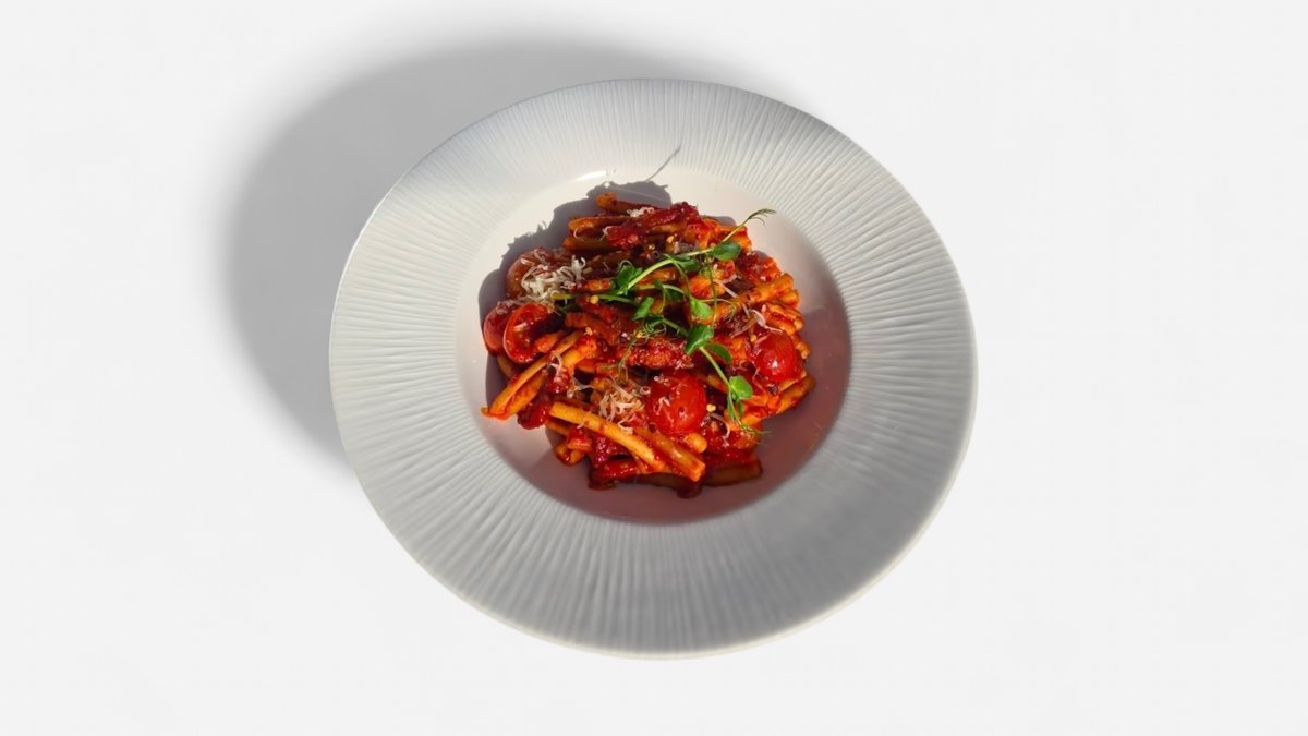 Classic tomato sauce with guanciale and grated hard cheese.