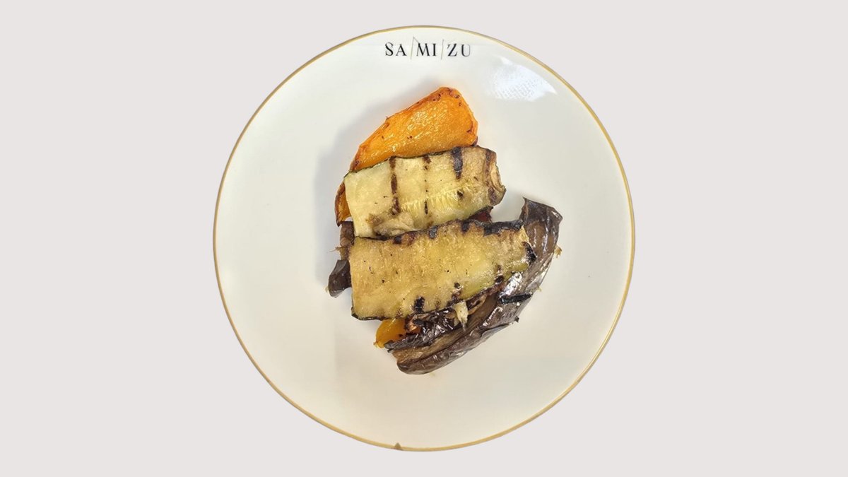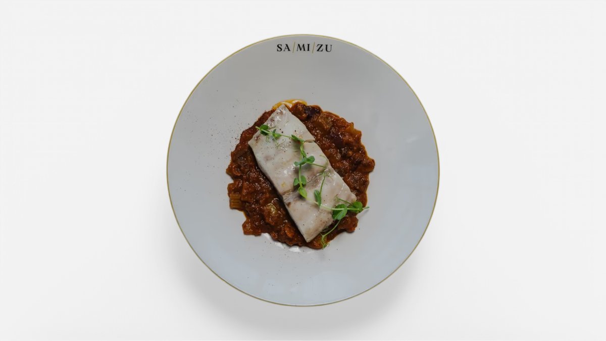 Meagre fillet 200g, marinara sauce, aubergine, zucchini, celery, bell peppers, olives, onion, pine nuts
